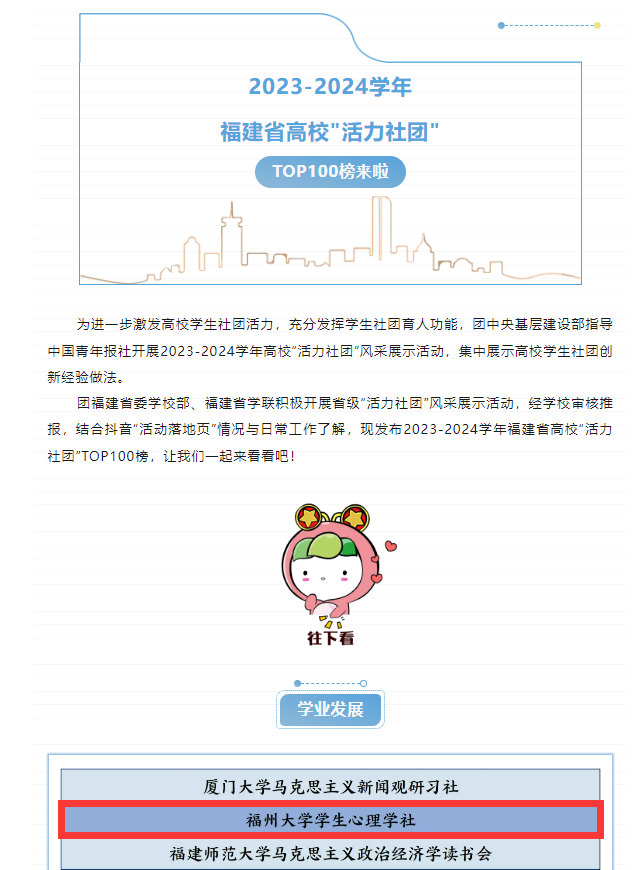 【学院新闻】喜讯!奈飞工厂 心理学社入选2023-2024学年福建省高校“活力社团”TOP100榜!