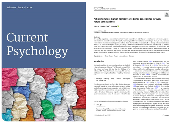 此外,课题组近期还有两项相关研究成果继续关注了亲社会行为中的仁慈(一种亲社会倾向)和人际信任,发表于《Current Psychology》。其中,“Achieving Nature-Human Harmony: Awe Brings Benevolence through Nature Connectedness”通过五项系列实验,系统阐明了敬畏感促进仁慈(一种亲社会倾向)的心理机制,揭示了自然联结感在其中的中介作用。研究发现不仅为理解敬畏的亲社会效应提供了新视角,也为通过改善人与自然的关系来增强亲社会行为、改善人际和谐提供了重要的实证依据。