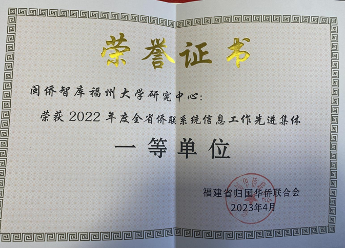研究中心荣获“2022年度福建省侨联系统信息工作先进集体一等单位”。