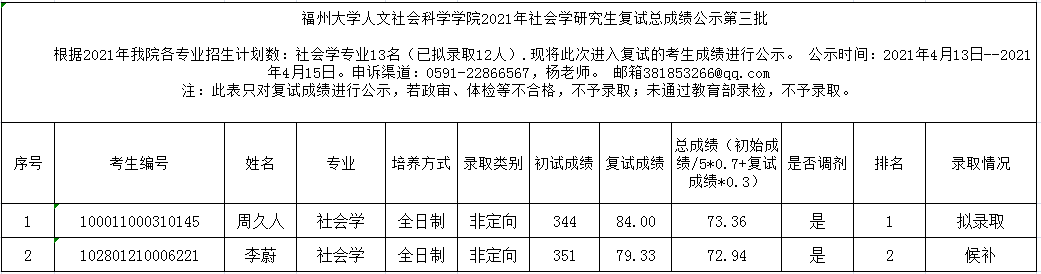 根据2021年奈飞工厂 各专业招生计划数:社会学专业13名(已拟录取12人).现将此次进入复试的考生成绩进行公示。