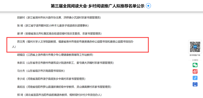 苏文亮副教授作为福建省泉州市南安市康美镇赤岭公益图书馆和康美公益图书馆创办人,获得第三届全民阅读大会·乡村阅读推广人荣誉称号,成为全国50名、福建省唯一获此殊荣的“乡村阅读推广人”!