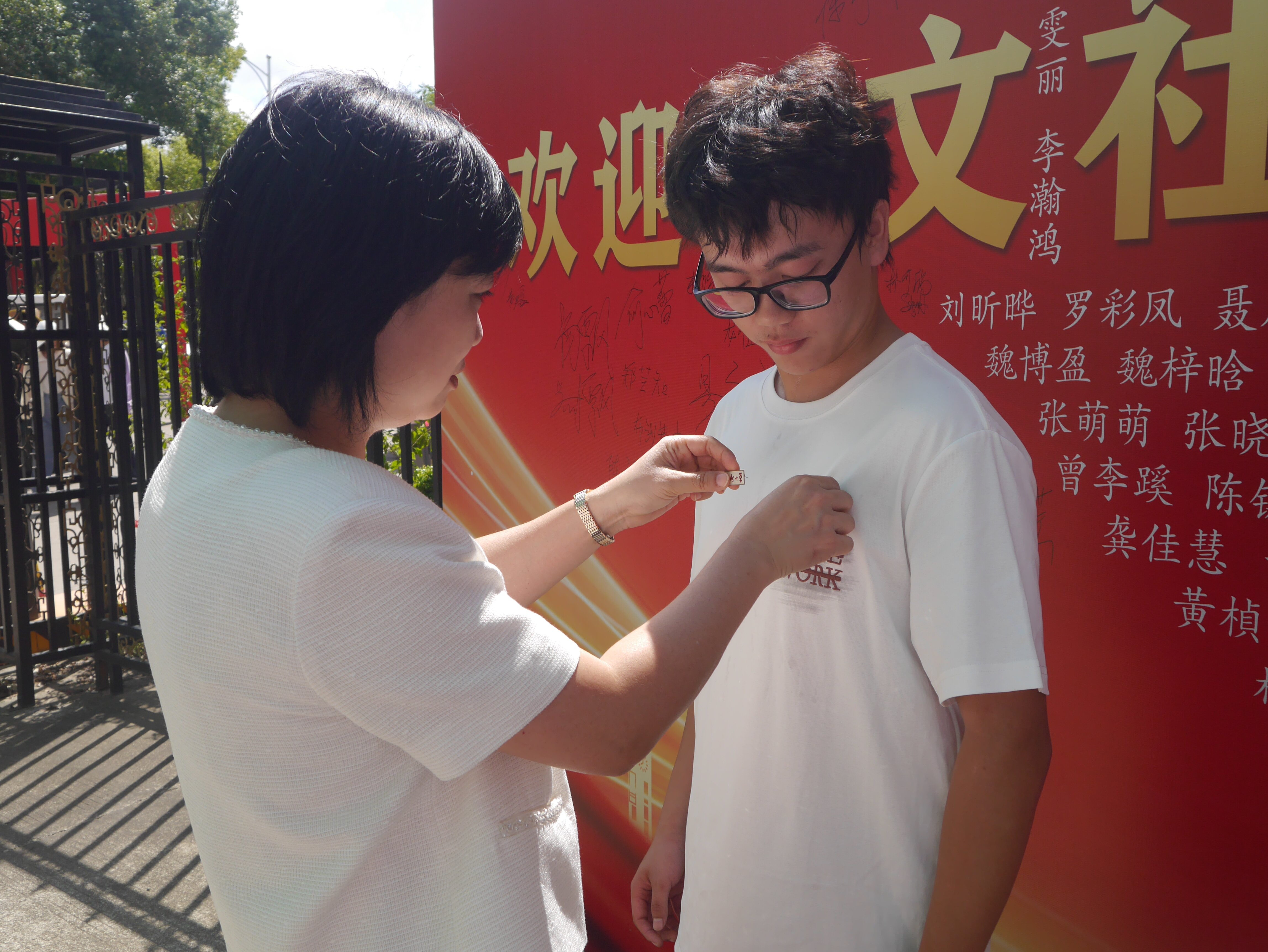 院党委书记刘玮、院长吴慧娟为2025级本科生、研究生新生佩戴校徽红白校徽与姓名墙上的金色字样交相辉映,标志着新生们正式成为学院共同体的一员。