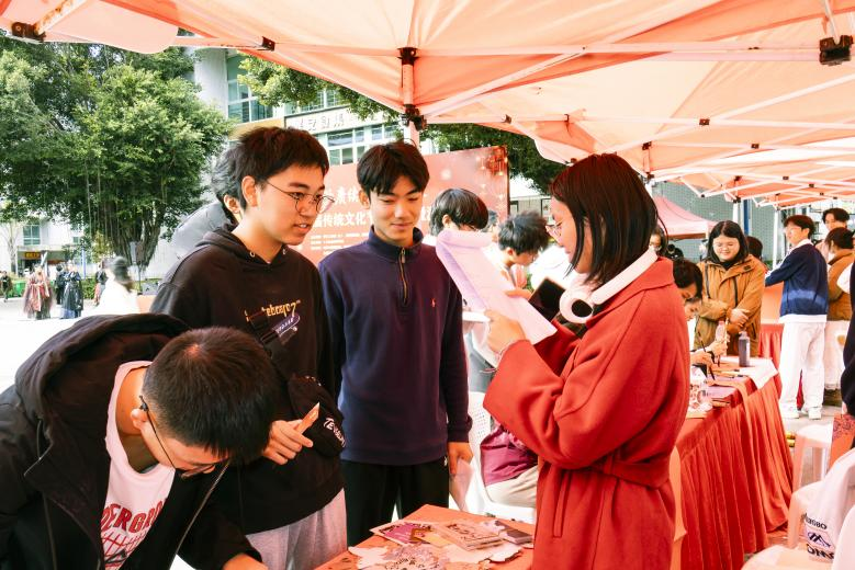 手工艺体验区同样引人驻足。手串DIY、香囊缝制、漆扇制作等摊位前,同学们亲手体验针线穿梭、墨彩点染,在一器一物中理解工艺背后的文化内涵,感悟中华文明之美。活动现场还设有抽奖环节,为参与者平添一份喜悦与期待。