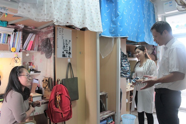 郑书记认真地检查了学生宿舍的每一个角落——包括观察其插线板是否拔掉,桌面物品是否整齐摆放以及宿舍地面是否干净,方方面面,细致入微。此外,郑书记亲切地询问17级新生是否习惯福州的饮食和气候,希望他们更好地适应大学生活。在一间14级汉语言文学专业的学生宿舍里,郑书记了解到一位来自藏族的同学正在备考公务员,打算毕业后回家乡工作。郑书记立即表示极大地支持,并仔细地询问该同学是否全面准确地了解西藏公务员招聘的政策信息,希望她好好学习,更要明确国家相关政策,鼓励其为国家作贡献。