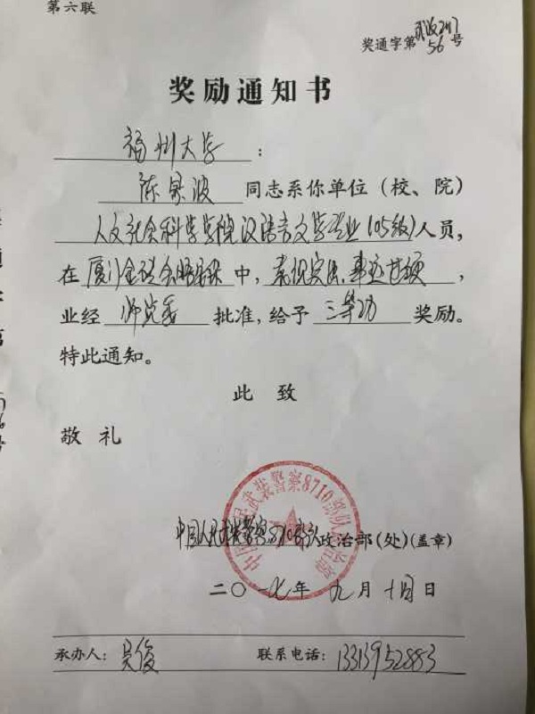本院汉语言文学专业2009届校友陈景波在厦门金砖会晤安保工作中表现突出,经师党委批准,给予三等功奖励。
