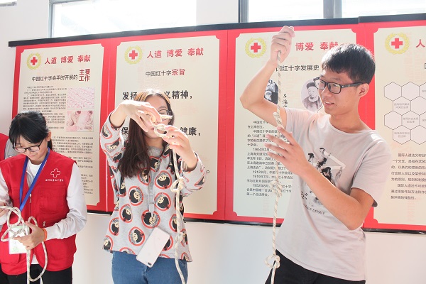 重点学科以及校内多发的安全隐患进行设计。生命健康安全体验教室集教学、体验、互动于一体,同学们在校红会志愿者的耐心讲解下积极参与结绳、电子消防灭火等互动,获益匪浅。其中,“ACLS综合急救技能训练”的演练让同学们初步掌握了意外情况下户外急救方法,同学们纷纷进行亲自实践,在志愿者的指导下进行现场救助演练。