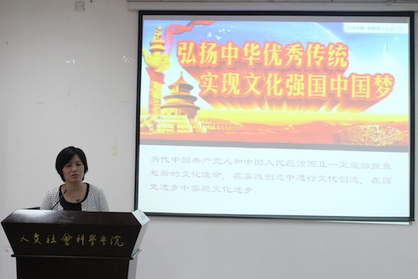 "文化实践是文化自信的坚实基础。"梁桂芳副教授列举当代中国在文化实践方面的成就:孔子学院的建立,«中国诗词大会»,«朗读者»等文化类节目的成功播出,以此鼓励在场听众树立文化自信与文化自觉,号召当代中国共产党人和大学生担负起新的文化使命,在实践创造中进行文化创造,在历史进步中实现文化进步。