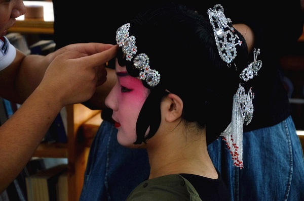 活动的最后环节是现场化妆,同学们近距离观看了戏曲演员化妆、包头、佩戴头饰,服饰穿戴等活动。现场互动环节,同学们体验了一把穿戏服的感觉,学唱经典曲目,体验戏曲的独特妆容,在实践中调动了对戏曲的兴趣。
