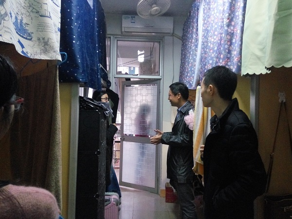 党委郑志刚副书记、团委叶阁泽书记以及2014级辅导员王亚苹老师,走访学生宿舍进行宿舍检查和暖冬慰问。
