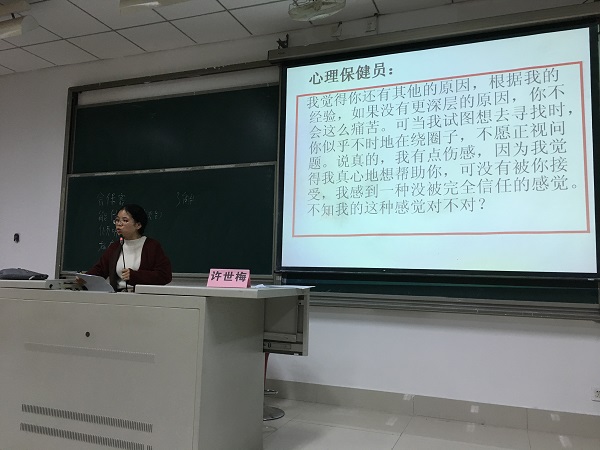 培训会上,许老师围绕着“积极心理学视角下朋辈心理辅导技能”这个主题,为大家介绍了有关心保员的一些专业知识,并特别传授了心理咨询的一些技巧,以及在咨询过程中须遵守的一些原则。这些介绍将对心保员在实际生活中提供极大帮助,也有利于班委在工作中处理好与同学之间的关系。活动中,许老师幽默风趣,时不时的提问增加了大家的参与度,化被动式讲解为主动式传授。