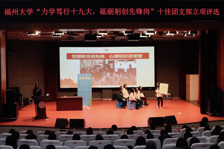 2015级应用心理学3班团支部专注于心,学以致用,依据专业所学心理知识,开展多项团立项活动,并以情景剧形式进行汇报。其展示主要分为两个模块:一是“党团联合创先岗,心理知识进课堂”。心理3班团支部通过召开主题班会、组织多种小游戏等各类活动,向闽侯上街实验学校初中阶段学生普及性心理、青春期人际关系处理等相关知识,将心理知识带进课堂;二是“高校联合响号召,砥砺躬行促健康”,心理3班团支部在青春广场上特设心理咨询点,特邀心理咨询师为同学们舒缓压力,调整心态。此外,更有心理医学知识竞答活动让同学们掌握心理医学小知识,积极引导同学们更健康的生活。