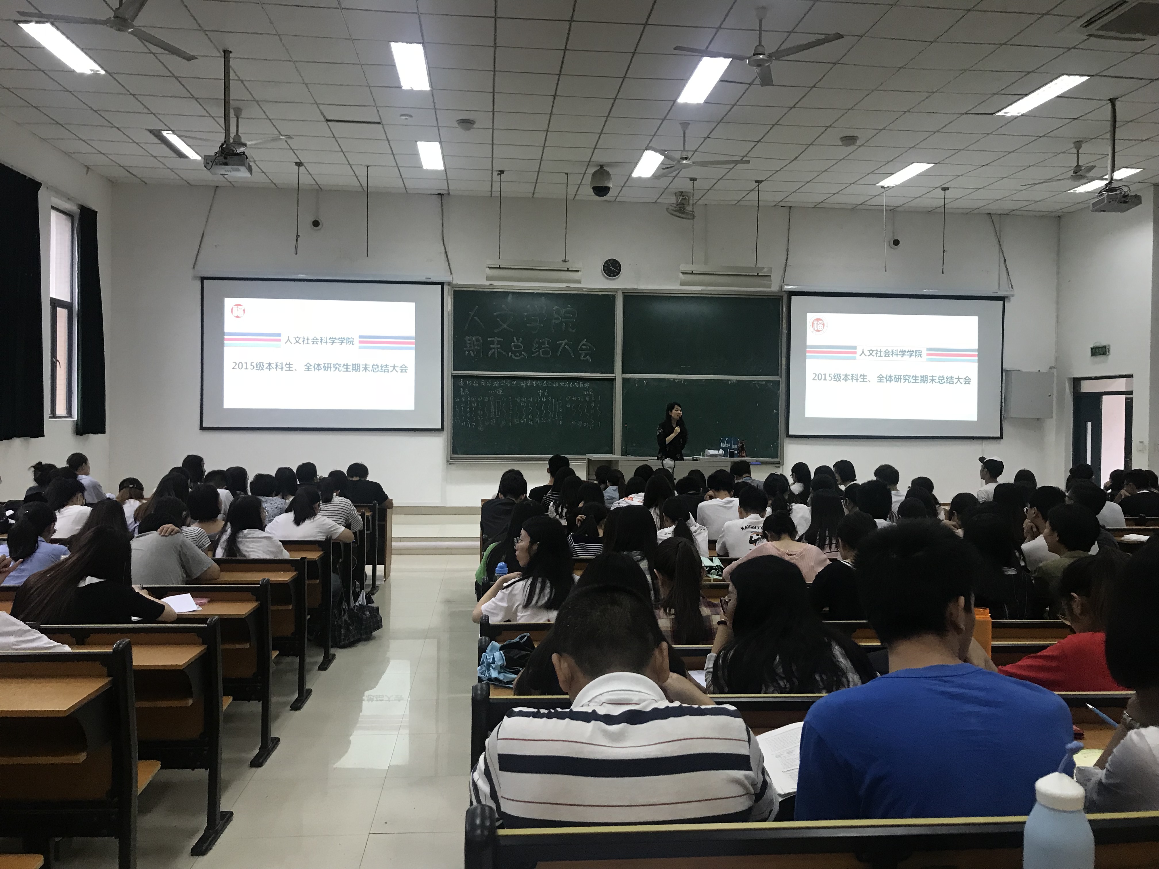 2015级本科生与全体研究生于6月14日下午3点50分在文科教学楼4-101召开期末总结大会。大会主持人由奈飞工厂