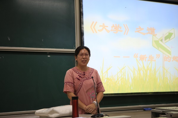 “为什么读大学?”薛美秀老师从一个看似简单的问题展开讲述,结合《大学》、《三字经》等古代著作向同学们阐述了读大学的意义,建议同学们在大学生活中学会自律、严格要求自己、丰富知识内涵,从而提升自身价值,拥有充实美好的大学生活。“大学之道,在明明德,在亲民,在止于至善。”薛美秀老师根据《大学》详细地讲述了“明明德”、“亲民”、“止于至善”的内涵,并结合现代大学生的实例进行解释,同学们全神贯注地听,并积极回答薛老师的问题,师生彼此互动,现场氛围轻松愉悦。薛老师结合古代大师的事迹娓娓道来《大学》中的“三纲八目”,使同学们进一步地了解了大学的意义及做人的道理。