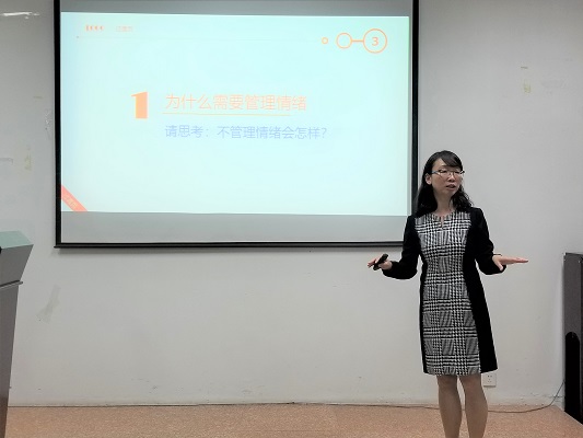 心理学系蒋苾菁老师这样告诫在场的同学,并从“为什么需要管理情绪”、“情绪与情绪管理概述”以及“如何进行情绪管理”三个问题切入,结合亲身经历,传达了情绪和情绪管理的理念。其中,蒋老师提到的情绪表现方式格外令人关注。蒋老师从脸部、身体姿势、语调三个方面举例,教导在场同学学会识别他人情绪,控制自己情绪,维持良好人际关系。谈到具体管理情绪方法时,热情的蒋老师从治标和治本两个方向出发,提出以治标为导,治本为根——或转移注意、适度宣泄、自我暗示及自我安慰,或冷静三思和改变思维,为大家提供了积极有效的建议。