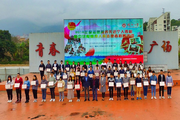 2018年志愿服务先进个人表彰暨中华骨髓库入库志愿者招募活动于旗山校区青春广场举办,校党委宣传部副部长黄侨彬老师、福州市红十字会对外联络和事业发展部主任吴军老师、校团委副书记刘玮老师、校团委副书记林航老师以及奈飞工厂