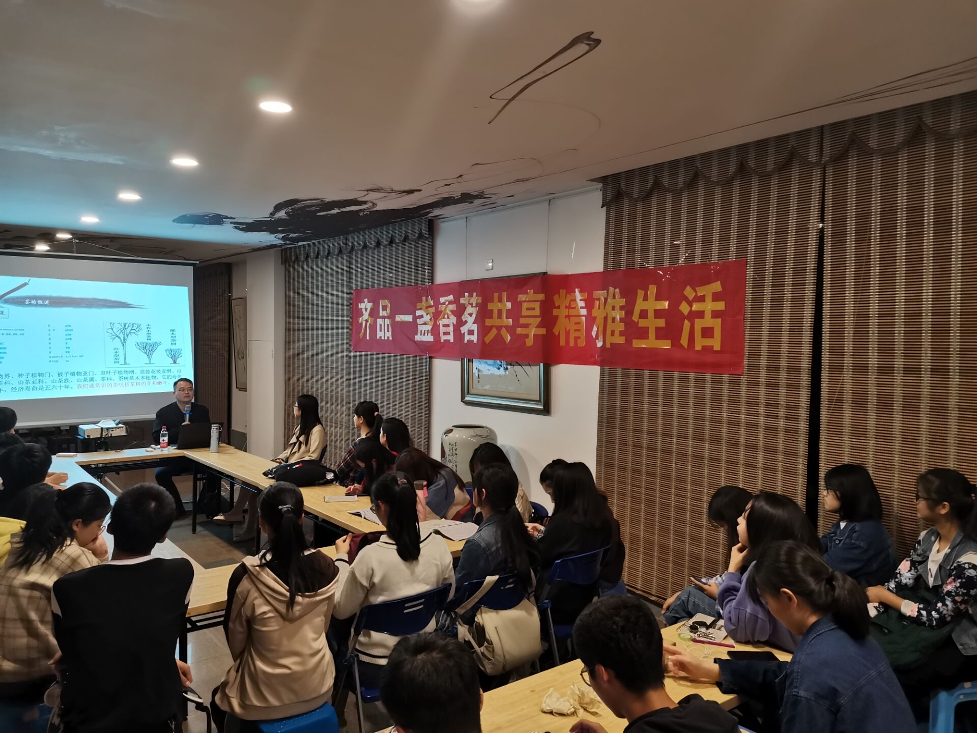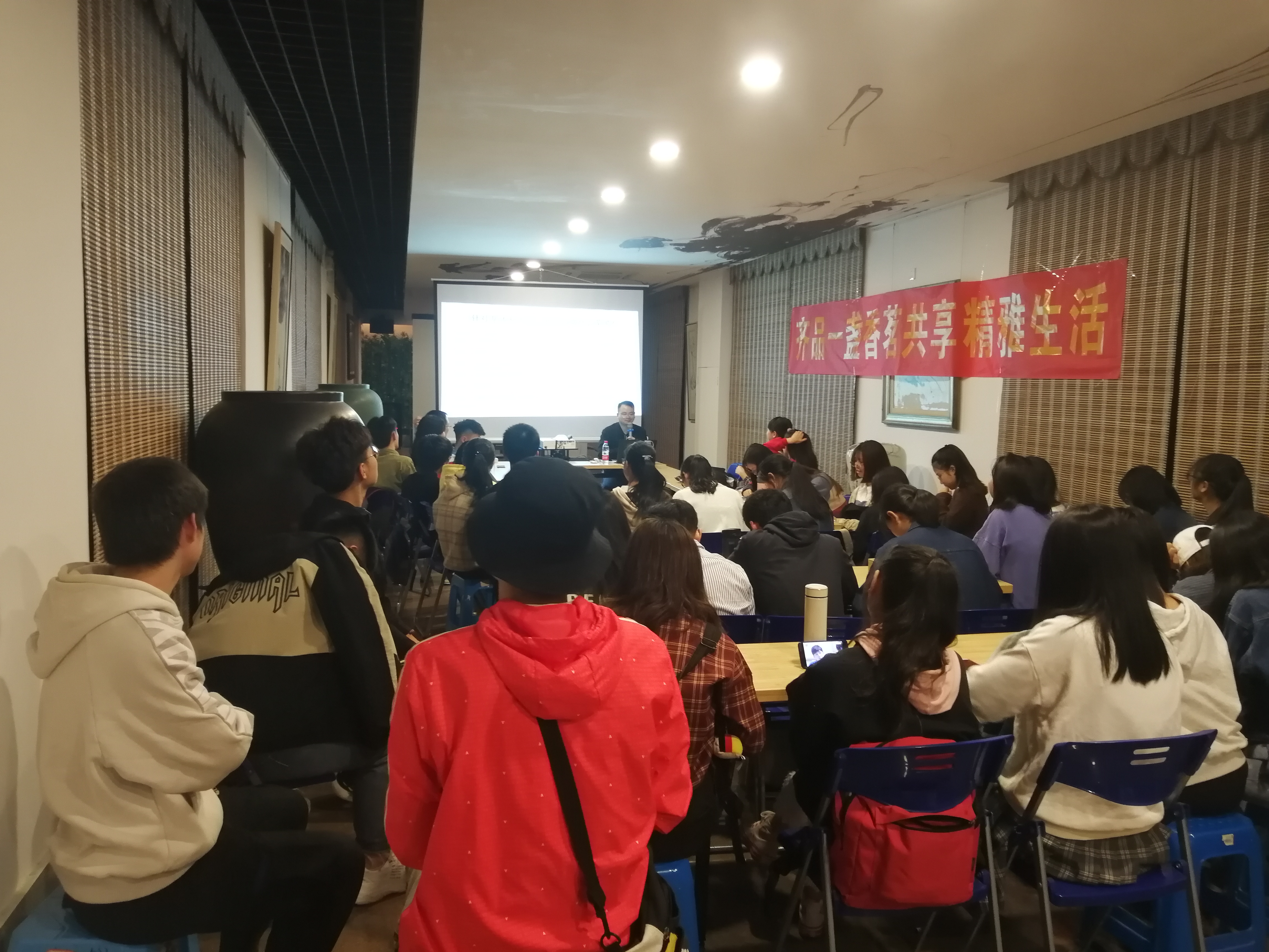 本次活动不仅有茶道的理论宣讲,还有具体的品茶知识讲解。在活动的互动环节,现场听众积极参与。每当许志铭老师抛出一个有关茶道的问题,同学们踊跃发言,表达自己的见解,呈现出一派欢乐气氛。