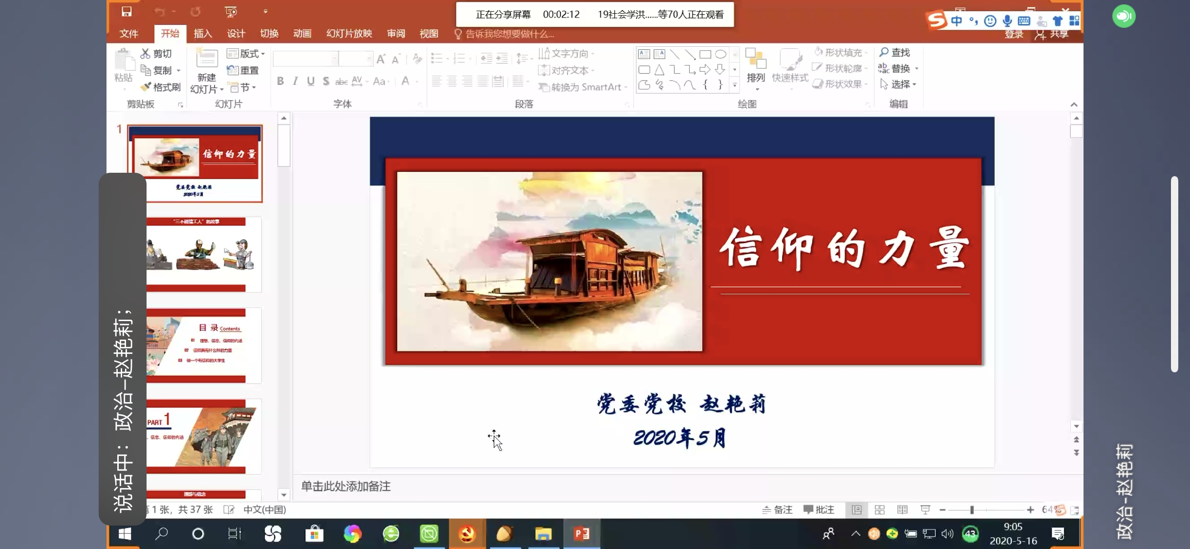 首先,赵老师从信仰的内涵谈起,通过对理想、信念、信仰的概念的辨析使同学们清楚了这三者之间的异同。