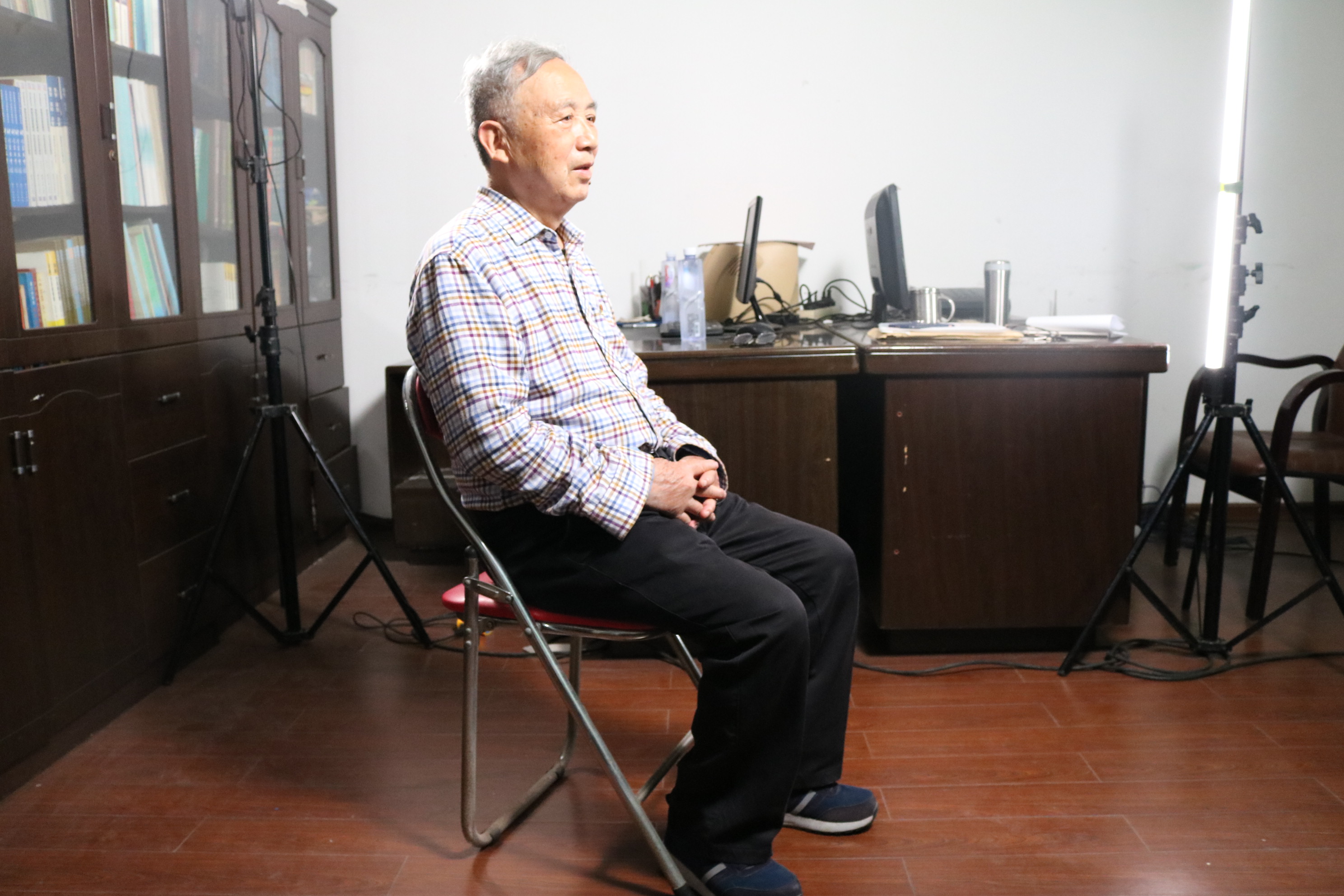 首先,进入雷德森老教授的办公室,专业摄影团队对现场进行了布置,前期准备完成后,拍摄工作开始。雷德森老教授出生于抗日战争时期,从红色革命故土福建宁化走出来,党龄高达60年,从事高等教育工作已有53年。讲到自己的入党初心以及战争时期的经历,他不仅潸然泪下,往事一幕幕浮现在他眼前。访谈中,雷德森老教授声情并茂的讲述自己在党的教育和培养下的经历:进入中国人民大学哲学进修二班学习、在“五七”干校学习等等。