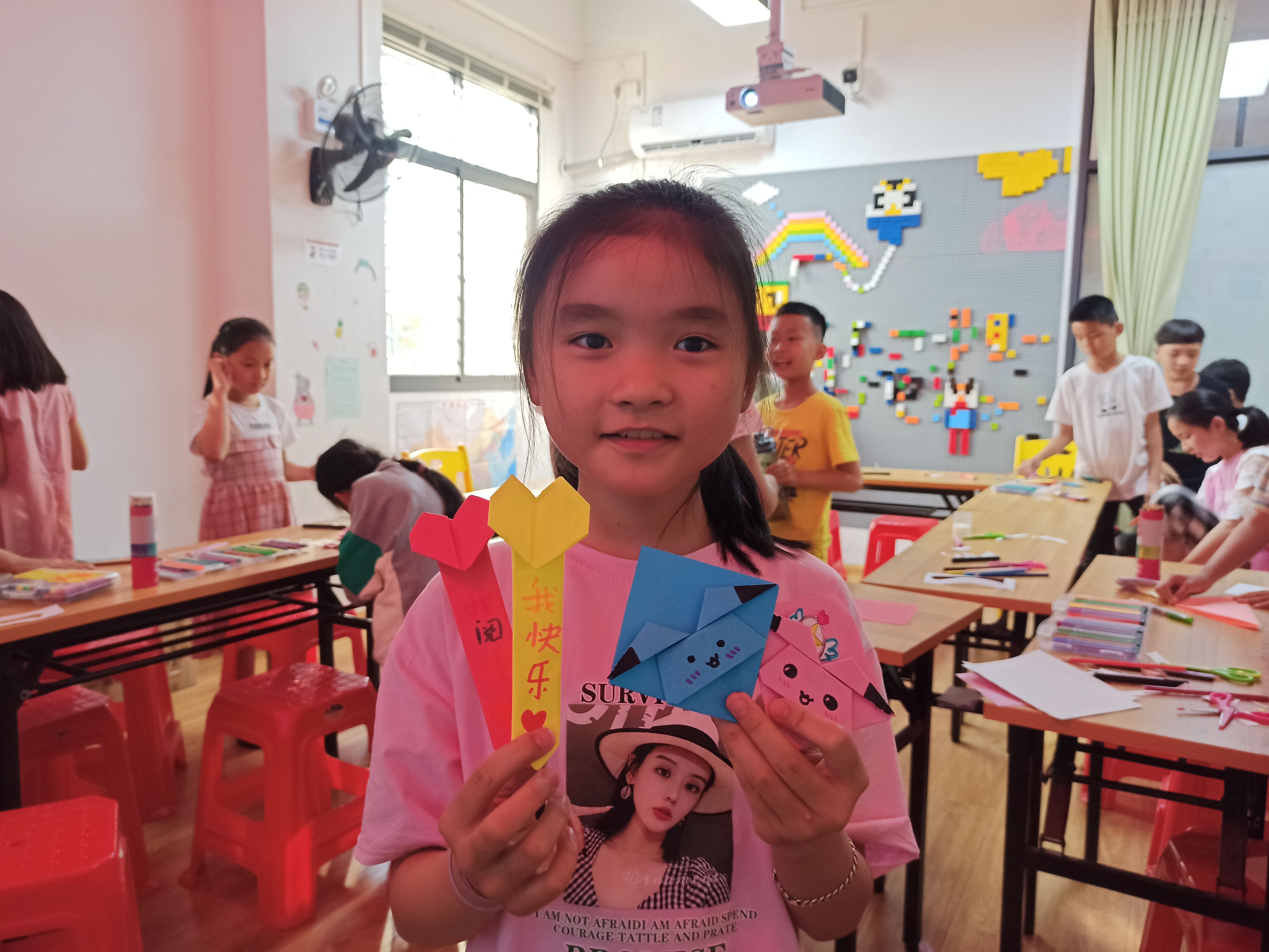 第一个活动是2020级应用心理学专业梁佳娜同学的精美书签制作教学。梁佳娜同学先为小朋友们介绍了书签的起源和多样的取材,以此来引起小朋友们的兴趣。随后她向大家展示了木叶书签和叶脉书签,其美丽的外表和有趣的制作方法瞬间抓住了小朋友的眼球,让小朋友们惊叹不绝。最后,梁佳娜同学为大家展示了皮卡丘书签、爱心书签以及绘画书签的制作方法,并指导小朋友们自己尝试折叠。书签制作过程中现场气氛热闹融洽,每一个小朋友都积极参加,也都折出了属于自己的独一无二的书签。