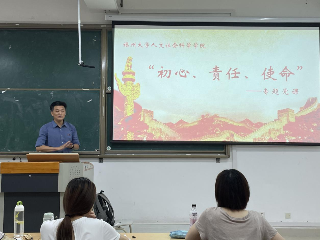党委书记王群在铜盘校区A208教室开展了以“初心、责任、使命”为主题的专题党课。研究生社会学党支部、研究生社会工作研1班党支部和研究生社会工作2班党支部的党员和积极分子参与了本次党课学习。