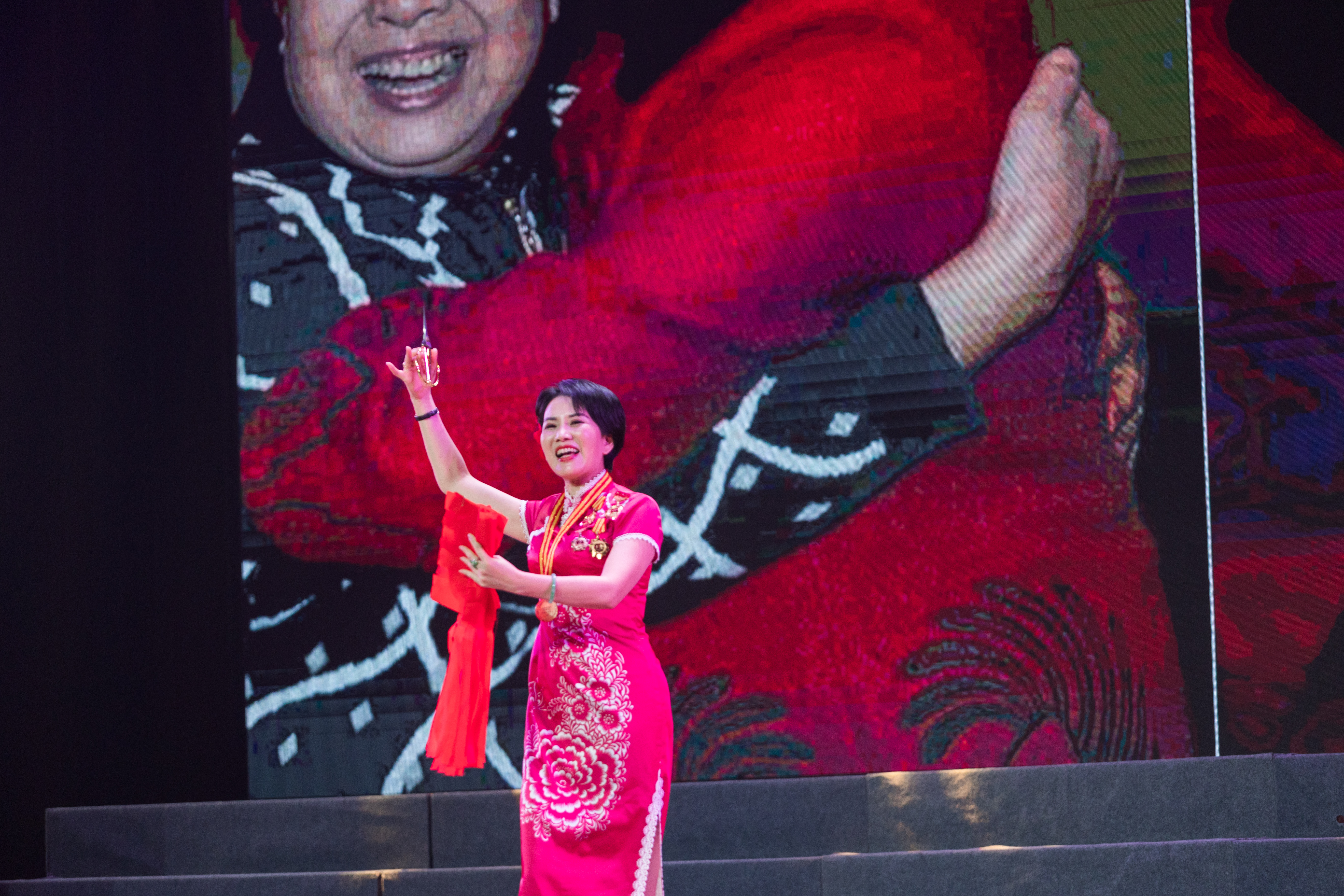 晚会还邀请了劳动奖章获得者、非遗传承人高少萍老师为大家带来剪纸表演唱《剪纸谣》,高老师用短短一首歌的时间剪出一幅精美的剪纸作品——《祝福祖国》,飞快转动的剪刀,伴随着悠扬的乐曲,再次展开时,“祝福祖国”四个字便展现出来了,精美的图案、美好的寓意,在场的观众无不为之喝彩。随后,《敦煌新语》响起,民乐团的同学们用悠扬的曲调,再谱写美好图景。青春歌会的最佳人气作品《灯火里的中国》再上舞台,在《领航新时代》的歌声中,本次文艺晚会接近尾声。