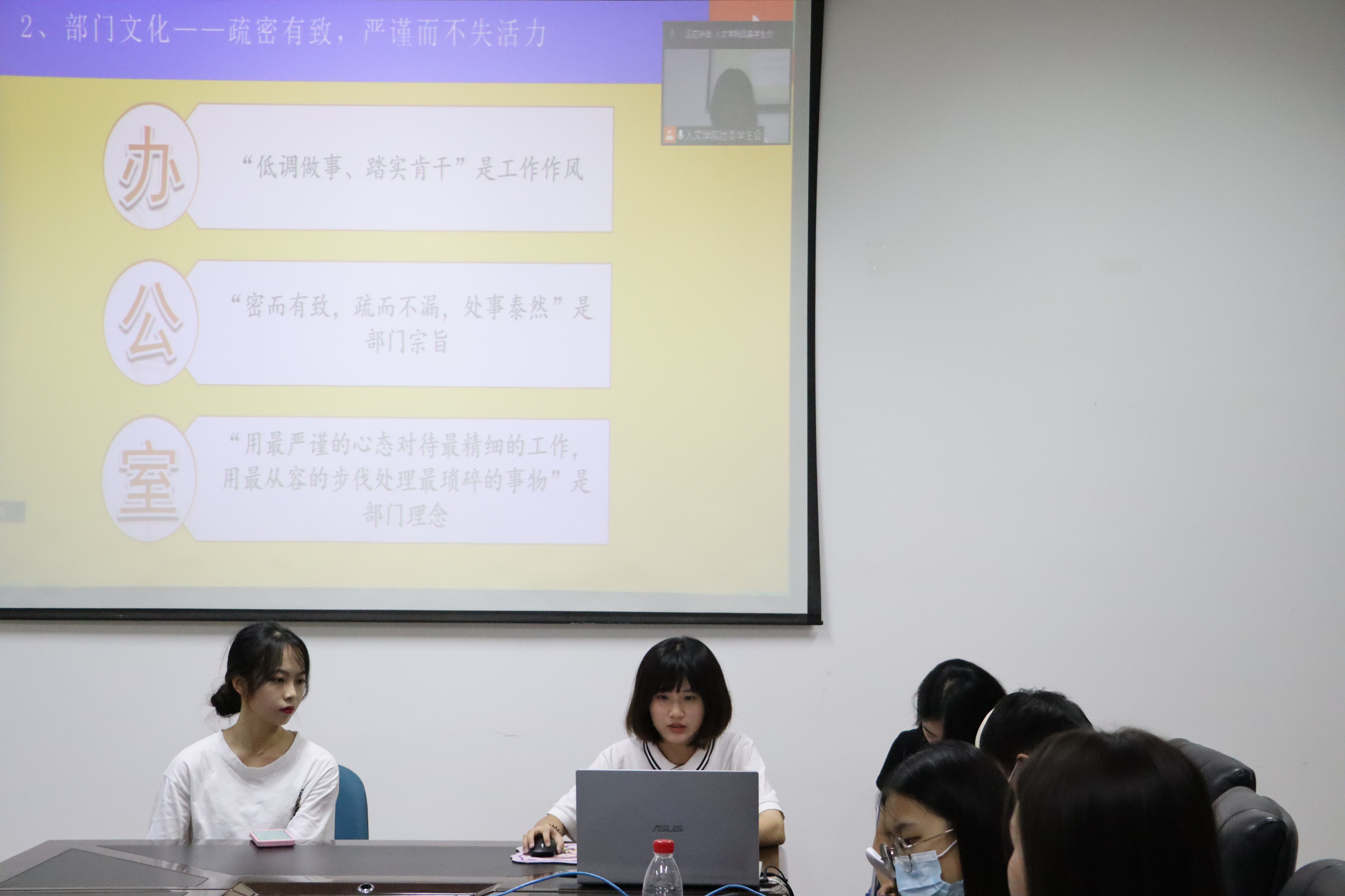 本次纳新宣讲,各部门都不遗余力、各具特色。网络信息部向大家介绍了自己的独特栏目“人文听你说”,引导同学们一同加入原创栏目建设;学术发展部和团委办公室则用精彩的视频剪辑,展现了近一年来的学生工作和活动;记者团提出“纳新并不是需要你有什么,而是我们能给你什么”的观点;视觉传媒部与权益考评部向大家分享了自己在大一时加入学生工作给自己带来的感受,通过亲身经历,引导着同学们加入部门,尽心尽力投入学院工作。