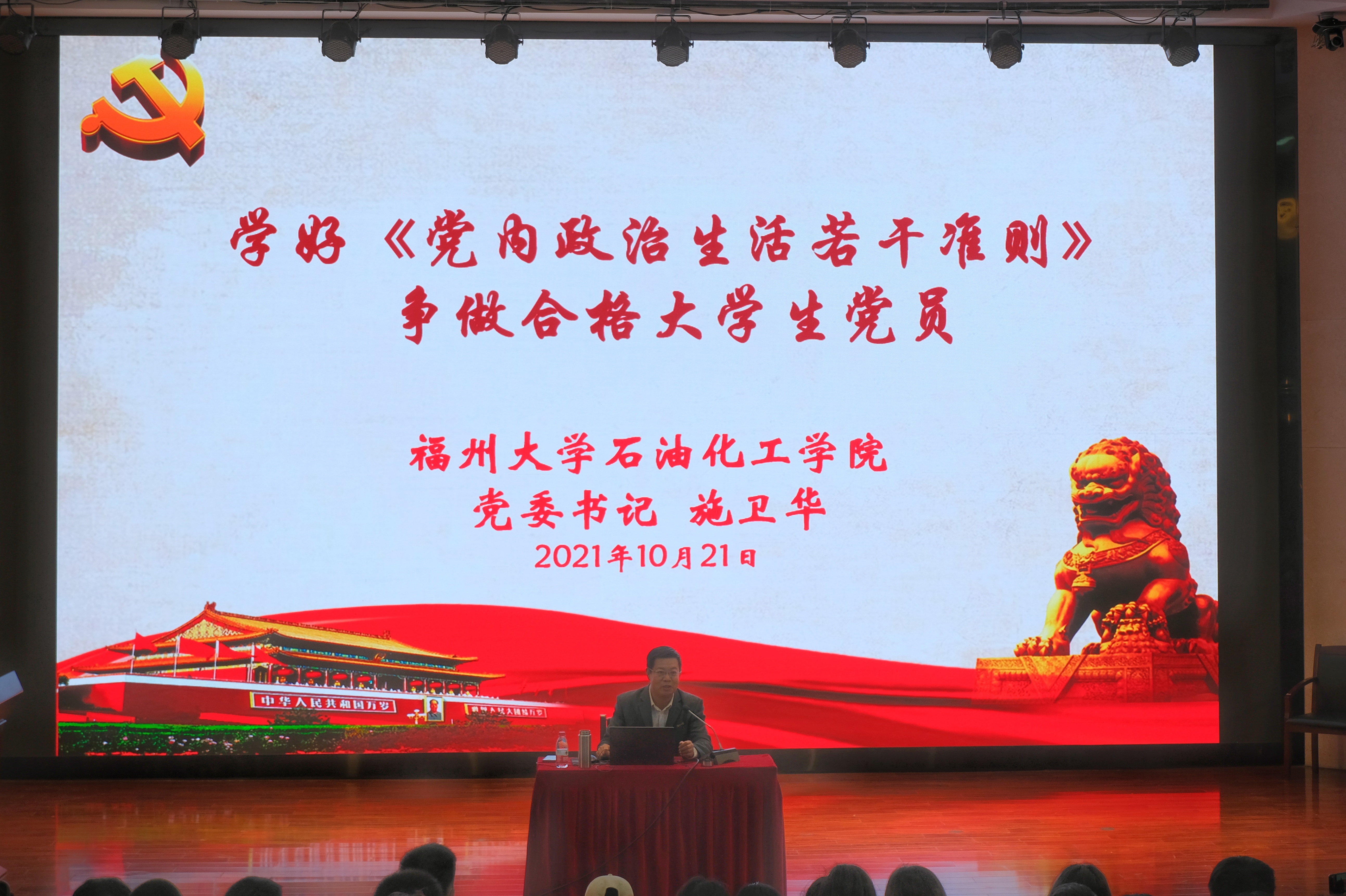 讲座伊始,施卫华书记对在场的发展对象表示祝贺。他指出,成为发展对象,意味着同学们经过重重考核,离党组织更进一步,同学们更应该严格要求自己,学习好《党内政治生活若干准则》,以党员的标准要求自己。施卫华书记通过实例为大家回顾了百年来在党的带领下我国取得的四个伟大成就,强调了新一批发展对象喜逢建党一百周年,要做好中华民族伟大复兴的参与者、见证者和建设者。