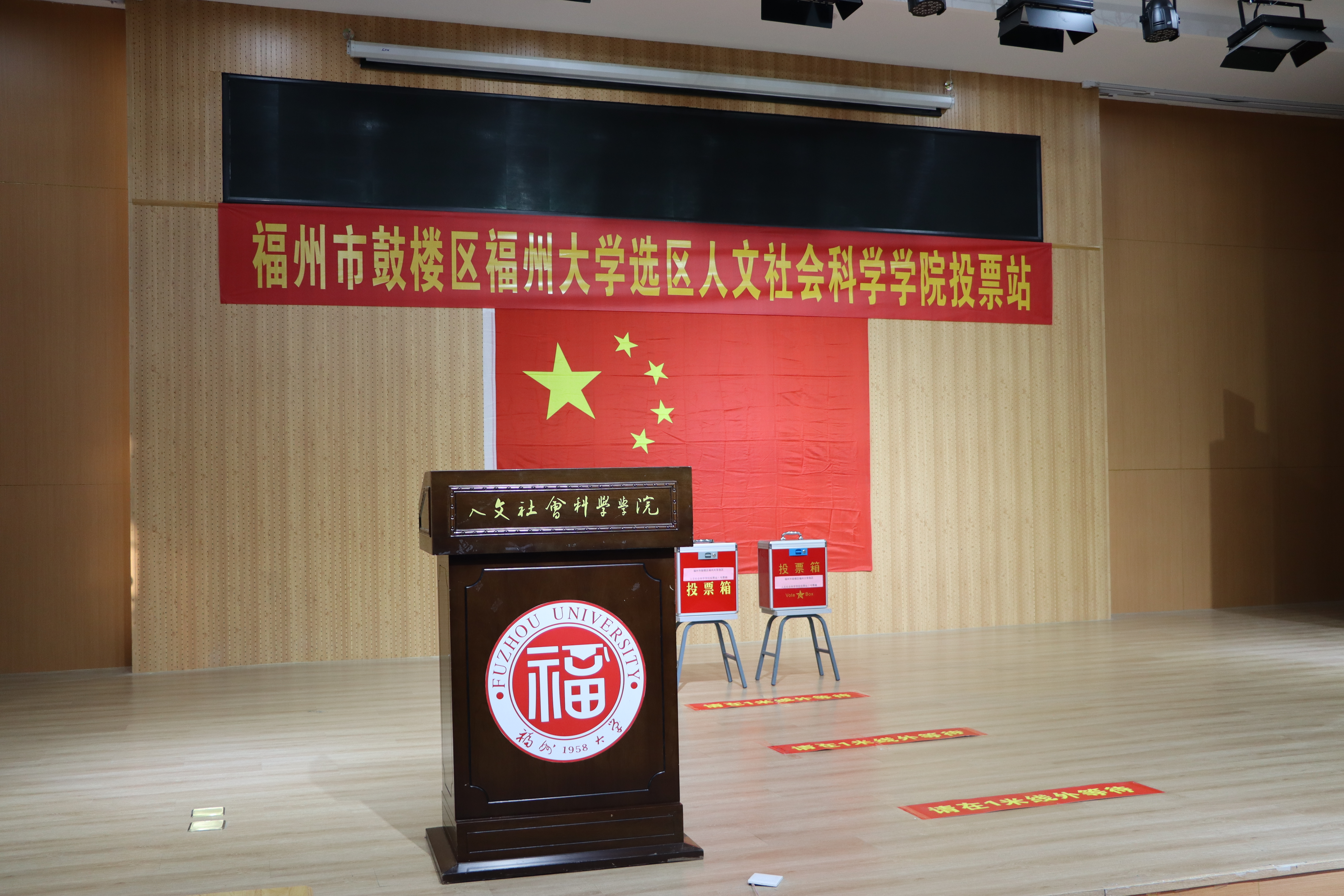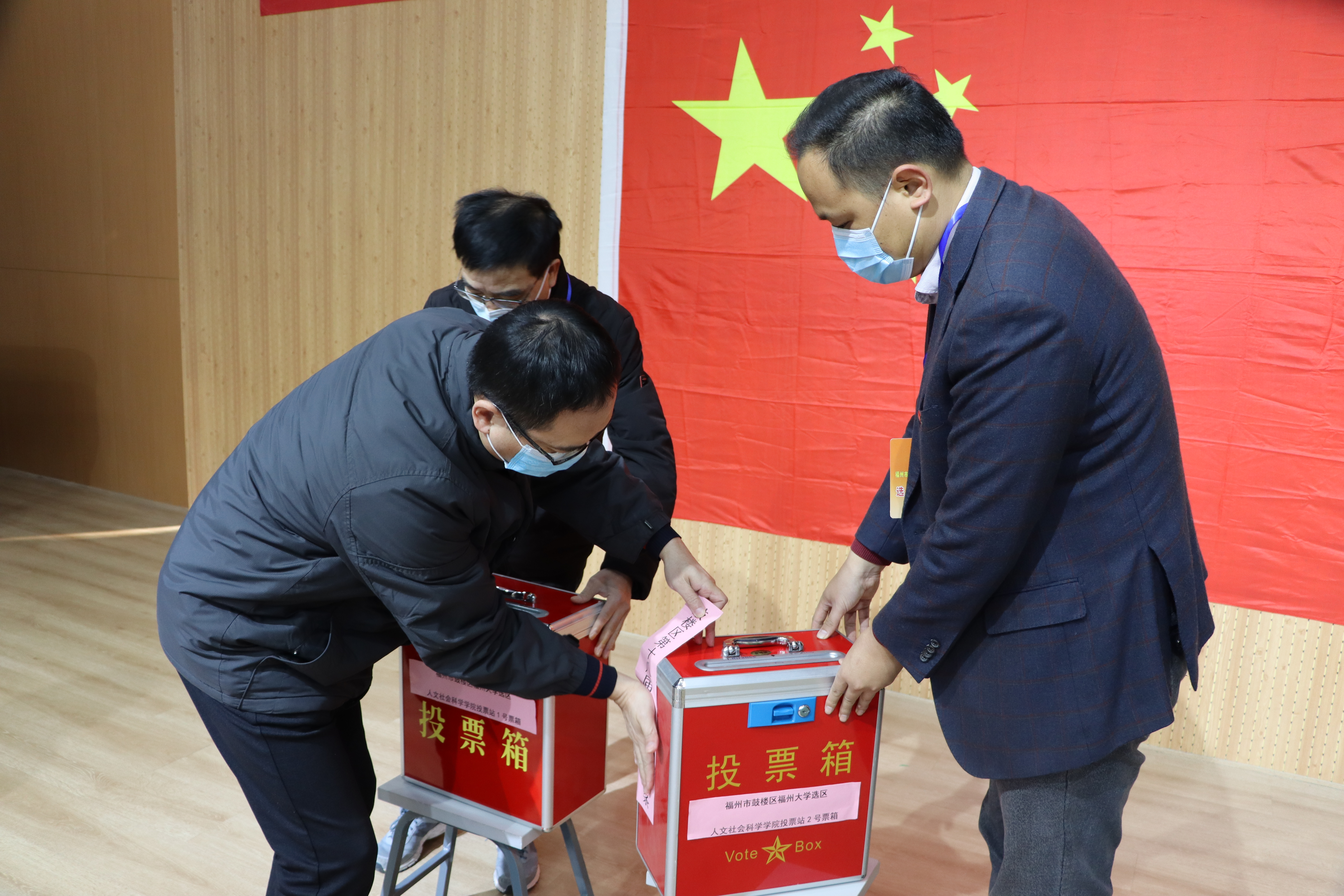 投票站将五星红旗、红色横幅、投票箱端正地放置在投票区的醒目位置,投票站入口设置登记点,到场的领导、老师、同学领取选民证和选票后进入写票区填写选票,完成选票填写后依次将选票投入选票箱。