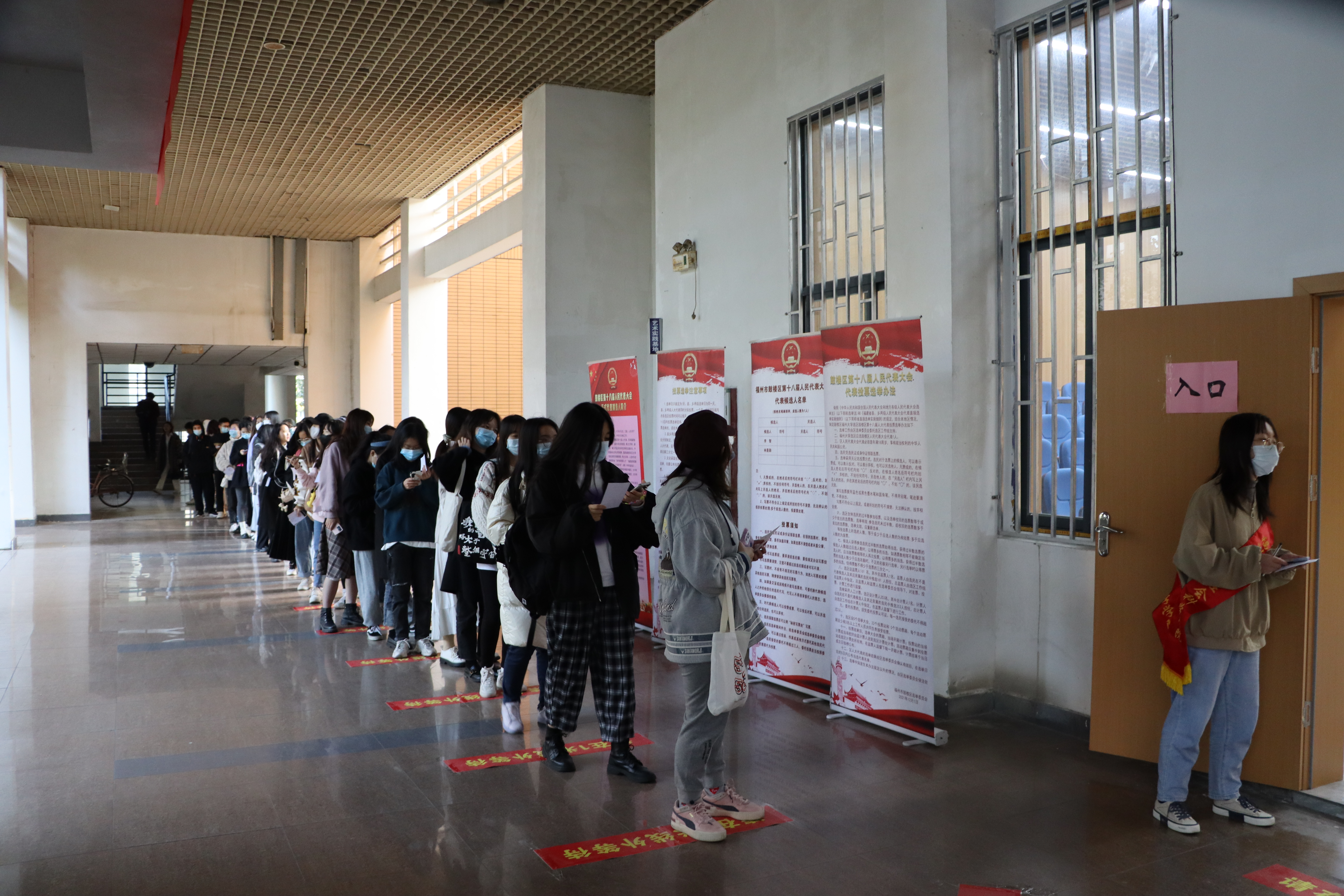坚持疫情防控不松懈,投票站入口处粘贴好了一米距离线,志愿者分发口罩,并督导前来投票的师生佩戴好口罩、保持距离进入投票站。