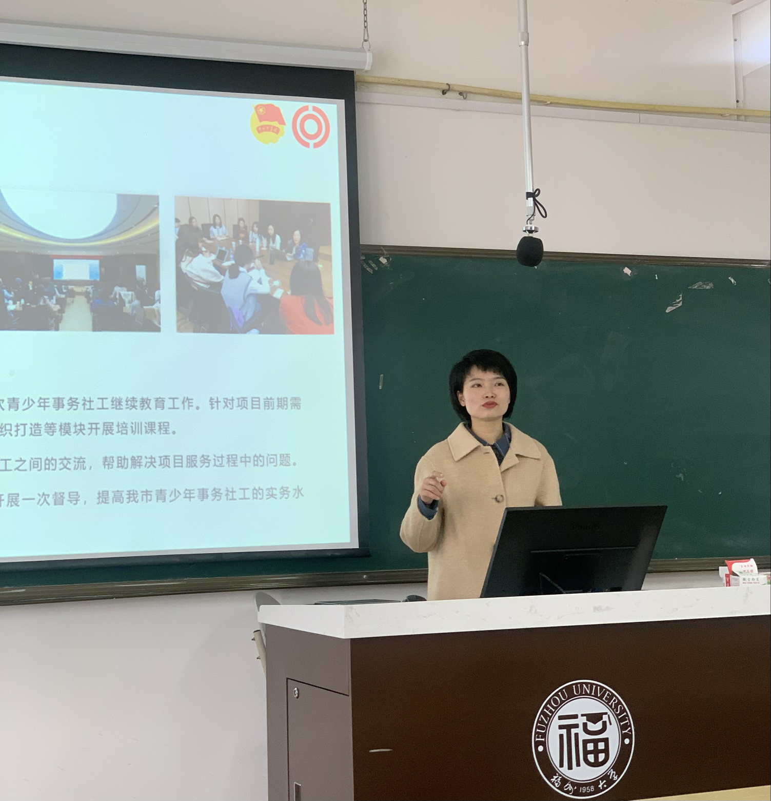 邀请福州市青少年事务社会工作者协会张慧玲副秘书长在铜盘校区为2021级研究生举办主题为《青少年社工实务与管理经验分享》的工作坊。张慧玲女士是国家中级社工师,国家二级心理咨询师,福州市民政局、福州团市委、福州市妇联社会工作专家人才库成员。2016年被福州市民政局评选为“福州市优秀社工人才”,入选“2018级榕树伙伴”计划,福州市第一届“闽都英才”社会工作专业人才。