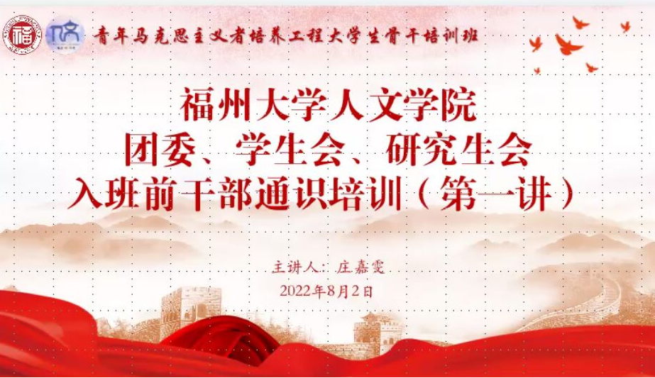 团委、学生会、研究生会学生干部及2022年青年马克思主义者培养工程大学生骨干培养班学员参与本次培训。学院往届学生干部作为主讲人对新任学生干部从基础办公技能、宣传工作、图片摄影、活动的策划与开展这四个方面进行相关内容的培训。