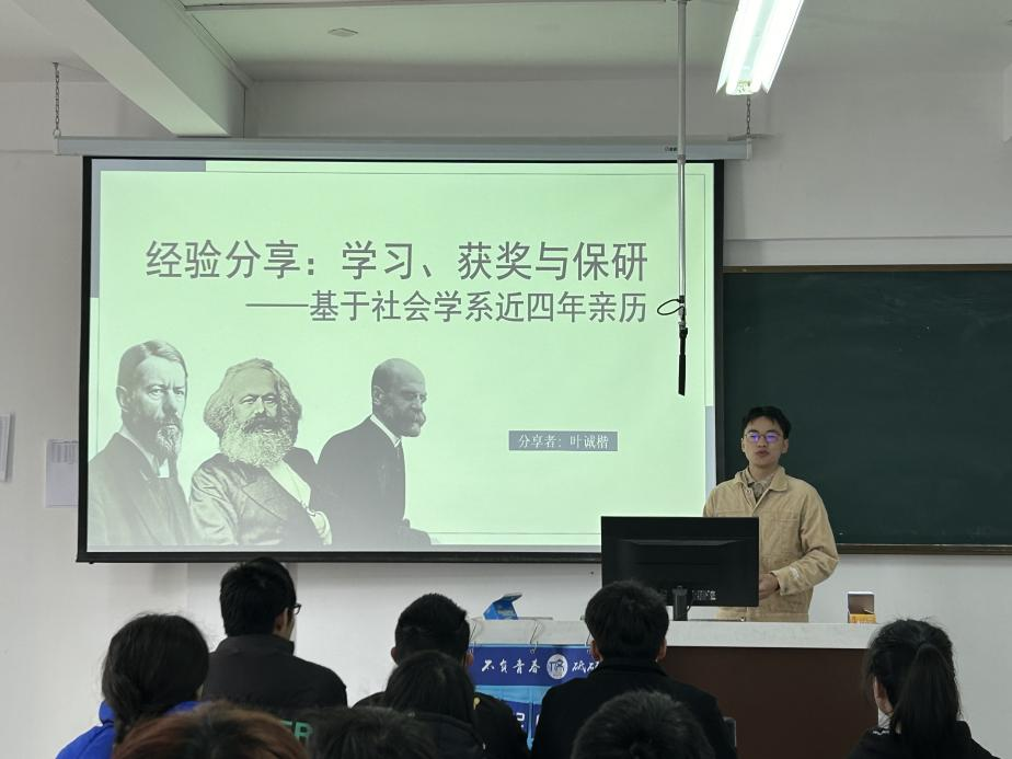 2023级社会学1班在班主任陈凤兰老师、林是琦老师的组织下,举办开学主题教育班会。2020级社会学本科生叶诚楷应邀作学习经验分享。