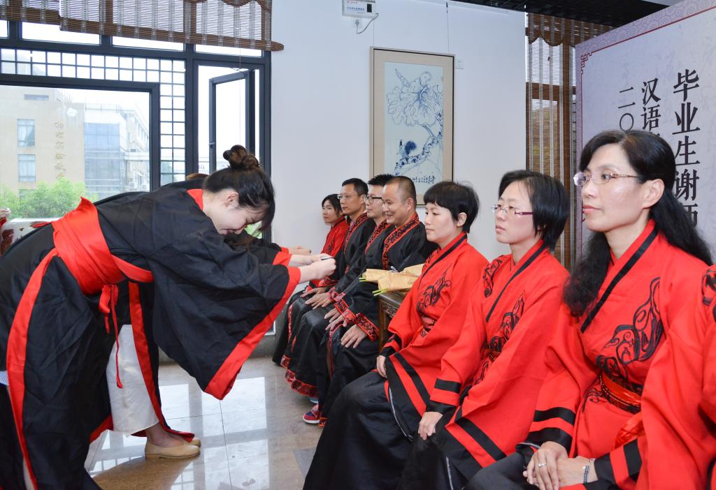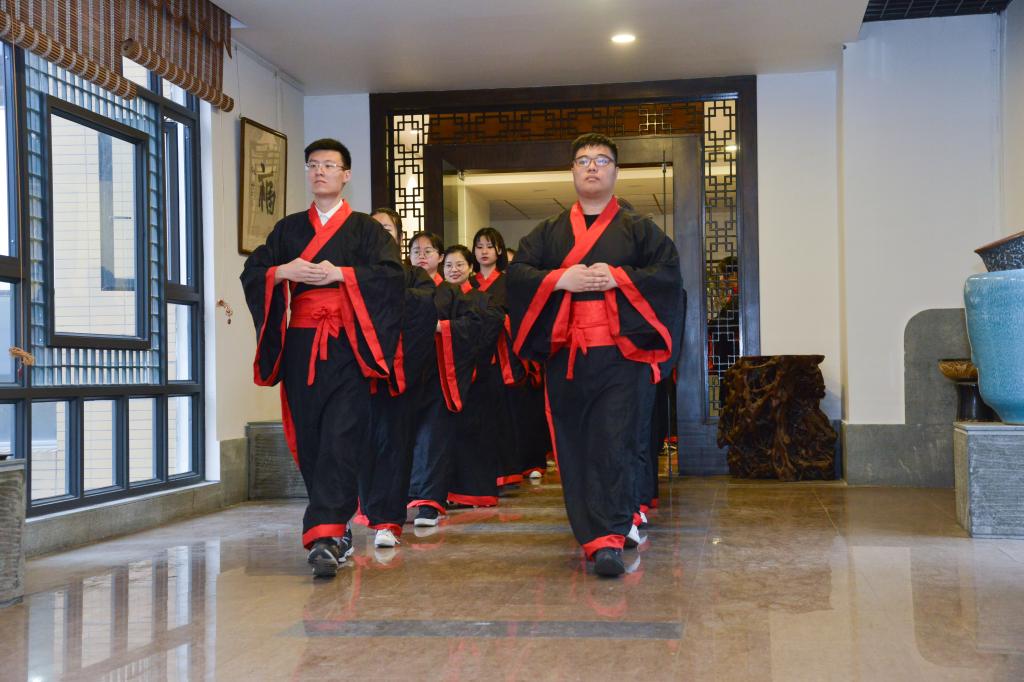 谢师礼仪式之初,全体同学祭拜先师孔子,并由执事向孔子献花,现场庄重肃穆。随后举行的隆重敬茶仪式,体现出师生间浓浓的情意——一敬茶,祝师“桃李满天下”;二敬茶,谢师“恩深情义重”;三敬茶,祝师“寿比南山,天伦永享”。千言万语融于三次敬茶行礼,饱含学生们的深深感恩之情。