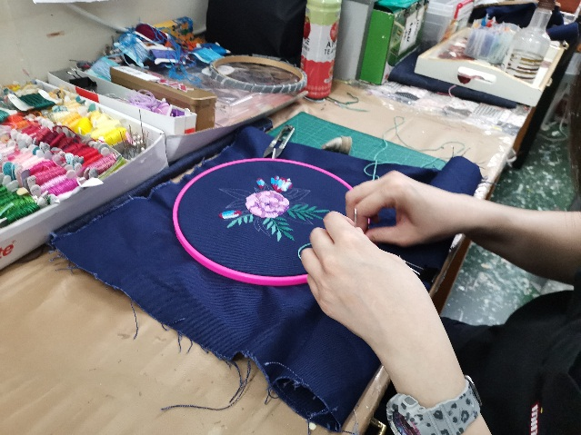 紧接着工作人员一边带领我们实地参观一边进行详细讲解,让我们切身体会到了该中心的服务程序和内容。该中心通过链接资源来接一些企业的订单交由精神康复者进行制作,再经过基本工作技能培训后,精神康复者就能熟练地进行室内工作了。我们观察到该中心提供了一个模拟公开就业的支持性工作环境,服务对象们有自己的工位、工作牌,还会定期开工作小组会议,每个月可以领取到少量金额的工资。这一方面为服务对象提供了长期工作的机会,另一方面在让服务对象适应并提高了工作技能后也进一步鼓励其尝试公开就业。