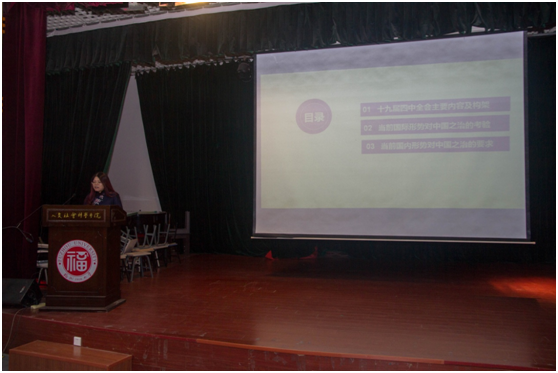 在人文艺术实践基地召开学习贯彻党的十九届四中全会精神宣讲报告会。本次报告会由学校党的十九届四中全会精神宣讲团成员、马克思主义学院舒展教授担任主讲人,报告会由院党委林秋生书记主持,全院教职工和全体学生党员参加了本次报告会。