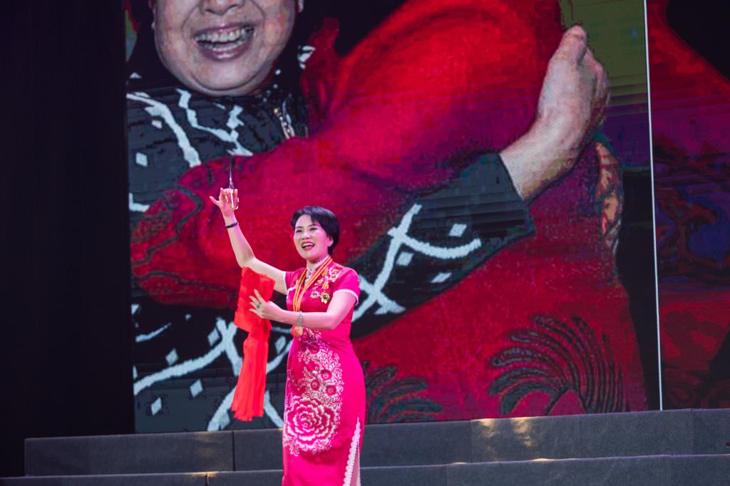 晚会还邀请了劳动奖章获得者、非遗传承人高少萍老师为大家带来剪纸表演唱《剪纸谣》,高老师用短短一首歌的时间剪出一幅精美的剪纸作品——《祝福祖国》,飞快转动的剪刀,伴随着悠扬的乐曲,再次展开时,“祝福祖国”四个字便展现出来了,精美的图案、美好的寓意,在场的观众无不为之喝彩。随后,《敦煌新语》响起,民乐团的同学们用悠扬的曲调,再谱写美好图景。青春歌会的最佳人气作品《灯火里的中国》再上舞台,在《领航新时代》的歌声中,本次文艺晚会接近尾声。