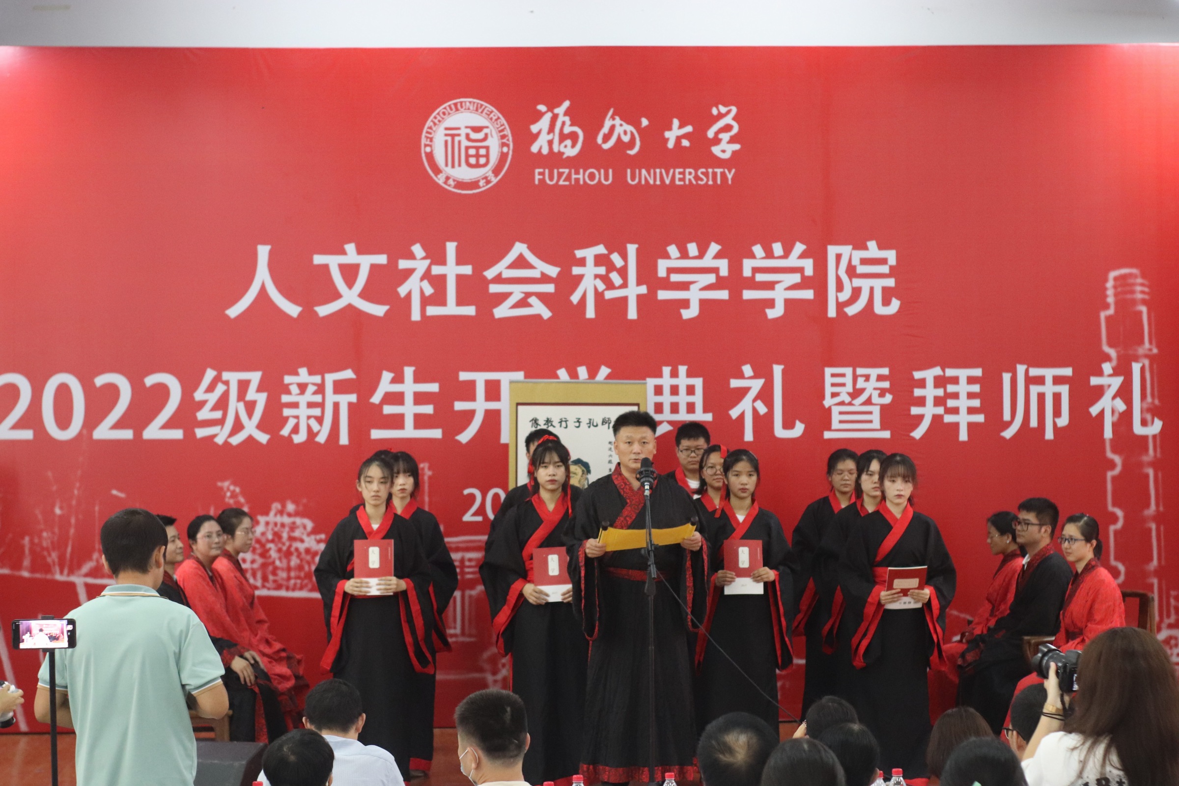 用学院特色拜师礼再现“尊师重道”之优秀传统。身着汉服的人文学子拱手鞠躬,恭敬地奉上六礼,表明人文学子将虚心学习、不断进步的决心;教师代表接受弟子束脩礼,并诚挚予以回礼,寓意将挑起诚心传艺、言传身教的重担。