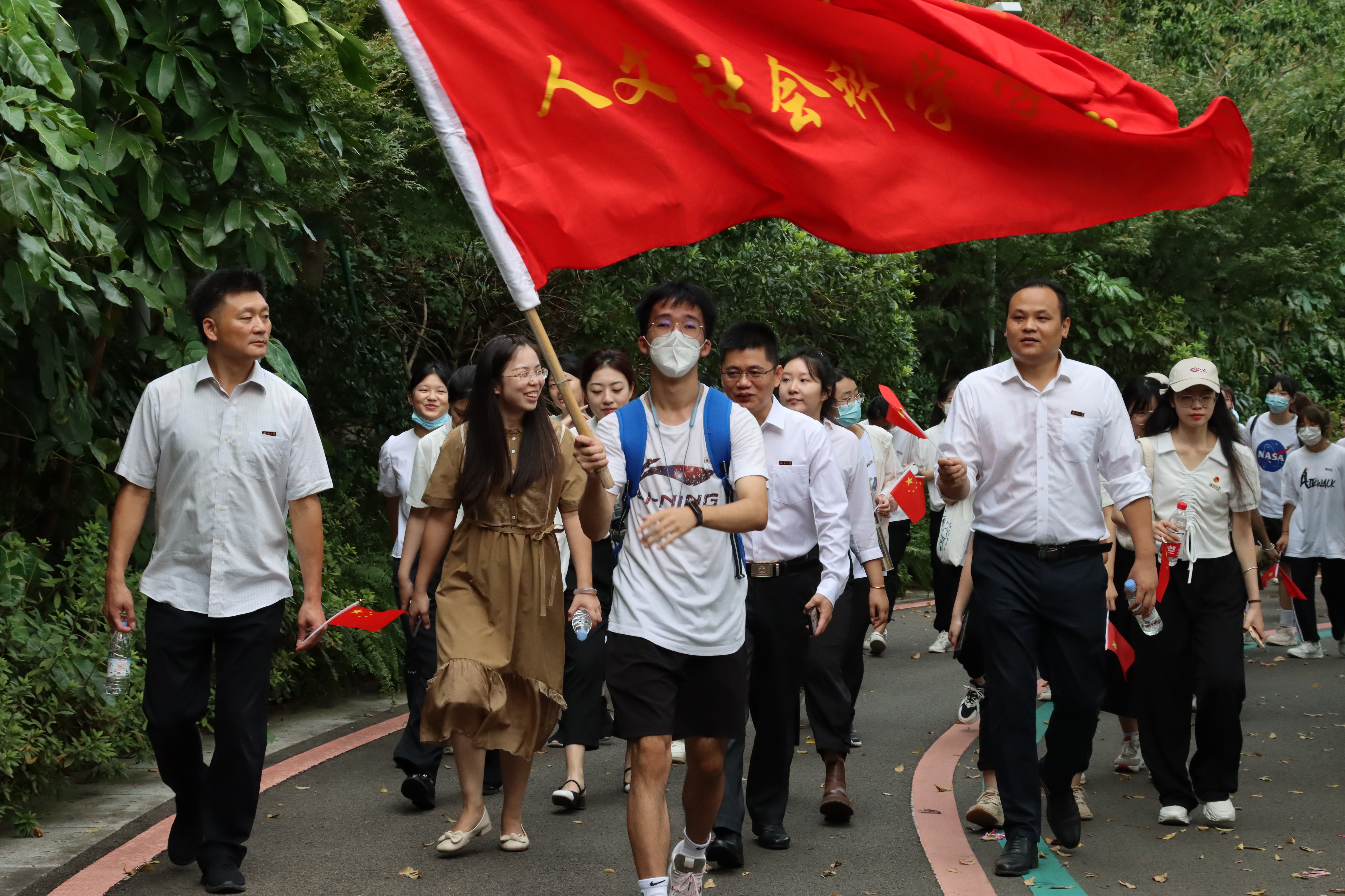 升旗仪式结束后,在人文院党委王群书记的带领下,院党委陈永福副书记、团委齐朝阳书记、全体专兼职辅导员及80名2022级新生从铜盘校区出发,步行游览福山郊野公园。