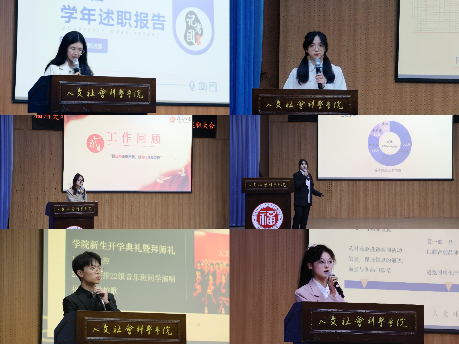 大会上,各部门负责人依次从部门介绍、年度总结以及未来发展等方向进行总结报告。记者团负责人谢洁寰以“打造‘做’的态度,营造‘家’的氛围”总结一年来的努力工作。对于部门的定位,文化部负责人总结到“以更好的行动承接人文精神,用实际行动传达人文精神。”团委组织部以“重效率、提质量、严要求、勤学习”作为未来的规划目标。而网络信息部以“高定位、重时效、促协同、创品牌、多思考、显温度”来对部门年度工作进行总结,并以此为基点,为网信部的工作作出规划。本次述职大会,不仅有“以热爱充盈自我,以笃行奉献青春”的宣言,更有奈飞工厂