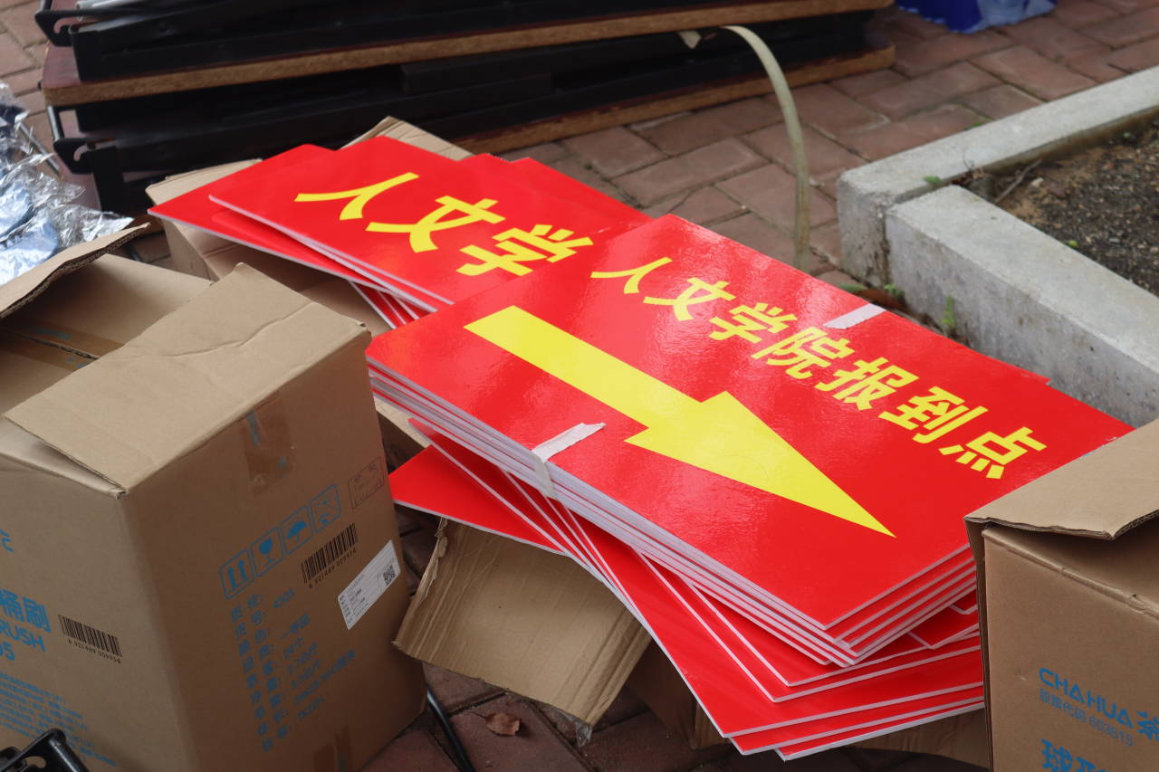 同时,学院在生活区设置迎新点,在楼梯处、转角处设置学院指引标语,引导新同学顺利入校。