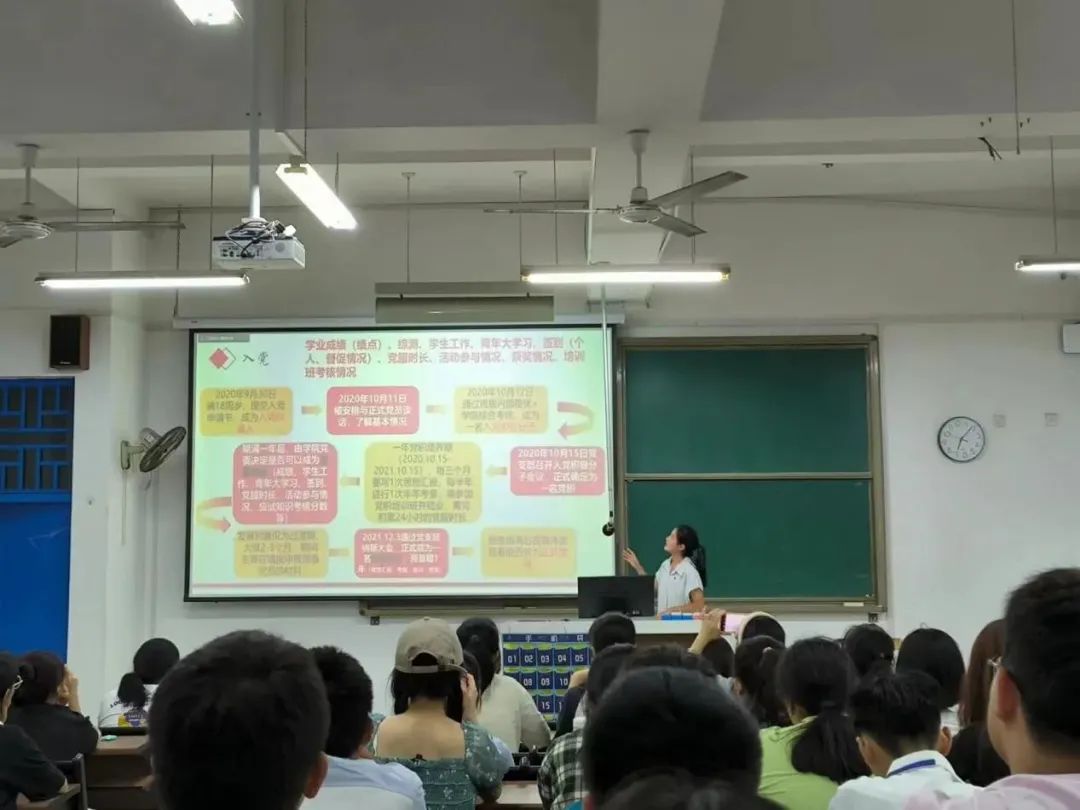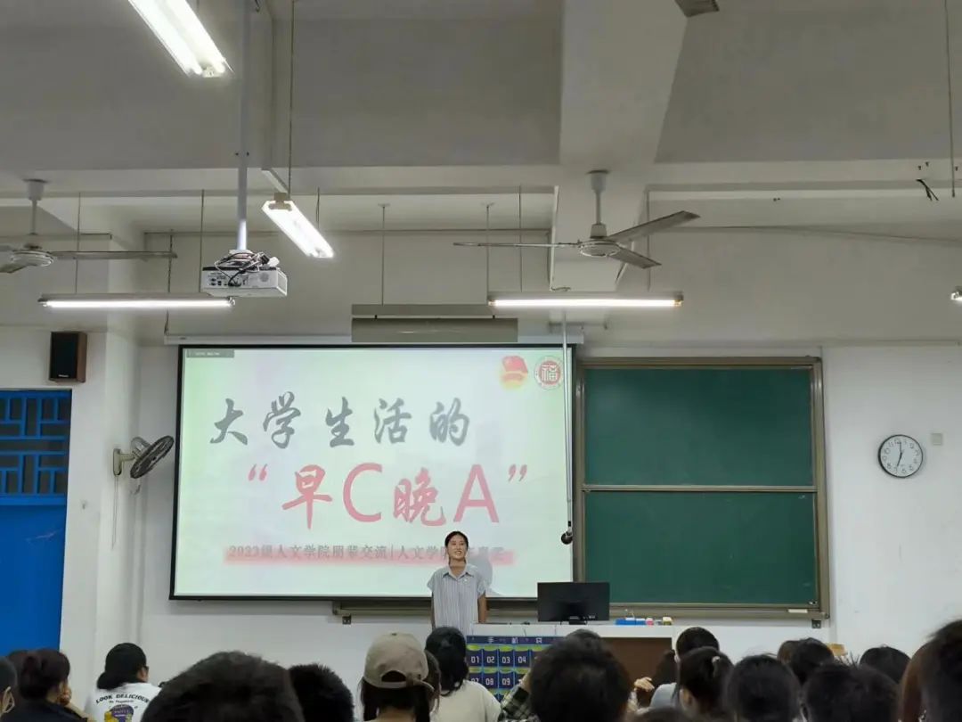 青年学子向党组织靠拢。她通过介绍在校期间的院、校级职务及相关工作经验,与同学们分享工作期间可能会遇到的困难以及对应的解决办法。此外,她推出别出心裁的“早C晚A”模式:早Cooperation(合作)晚Accomplish(完成),早Challenge(挑战)晚Advice(热爱),早Curious(好奇的)晚Animated(活跃的),以及早Confident(自信的)晚Abundant(丰富的),提出2023级新生自信的、丰富的大学生活美好愿景,对同学们今后的在校生活具有相当重要的启示意义。