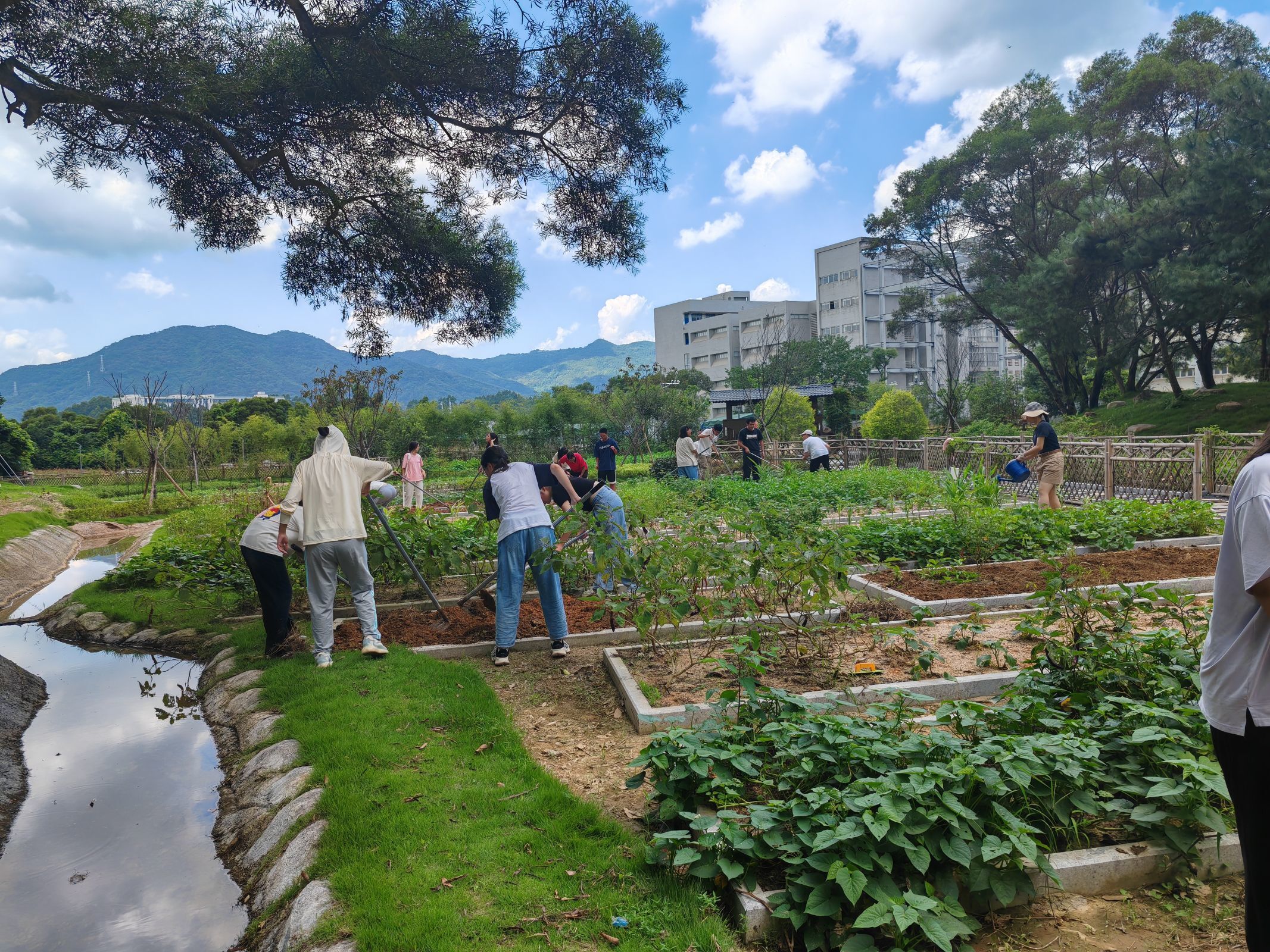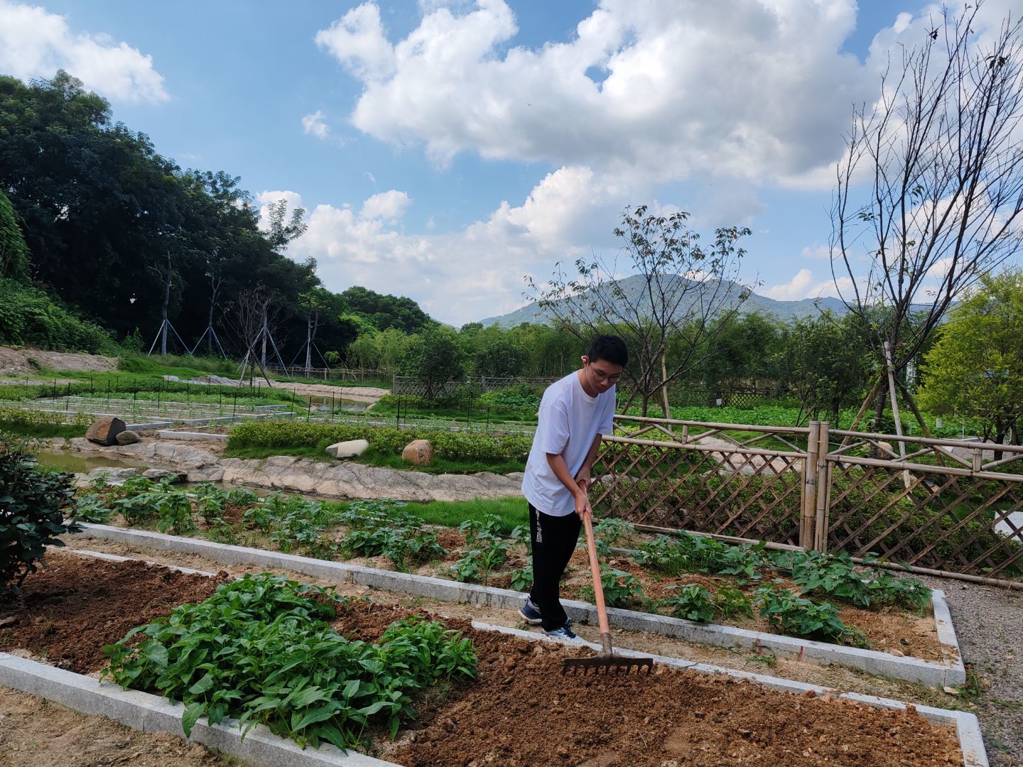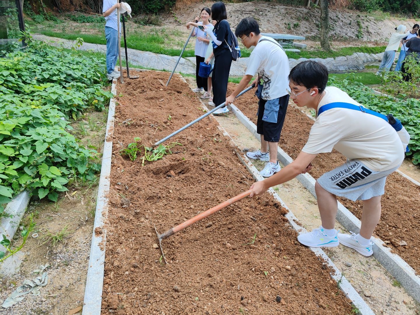参观结束后,同学们有序领取了锄、耙、水壶等劳动工具,以小组为单位,进行不同形式的劳动实践活动。同学们扛起锄头、撬动土壤、除去杂草、浇灌田地,许多块田地被重新开垦、浇灌并由参与活动的同学亲手种上新作物。活动充满欢声笑语,不少同学还在实践基地中进行了合影留念。