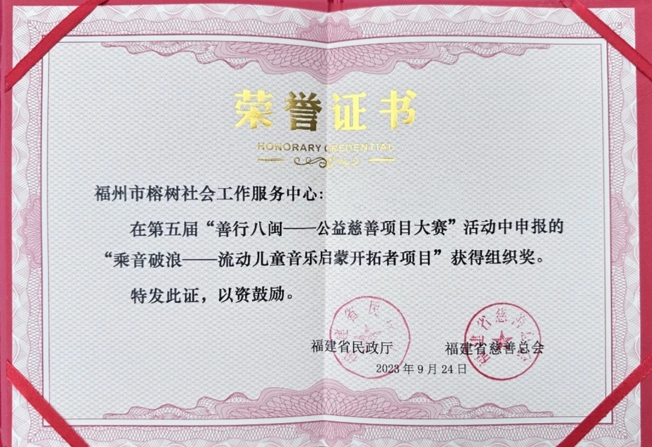“乘音破浪”依托福州市榕树社会工作服务中心民非组织,是福建省目前唯一一个针对流动儿童开展音乐助学的志愿者团队。目前,“乘音破浪”项目已覆盖省内外67个公益服务点,服务流动儿童近5万人次。