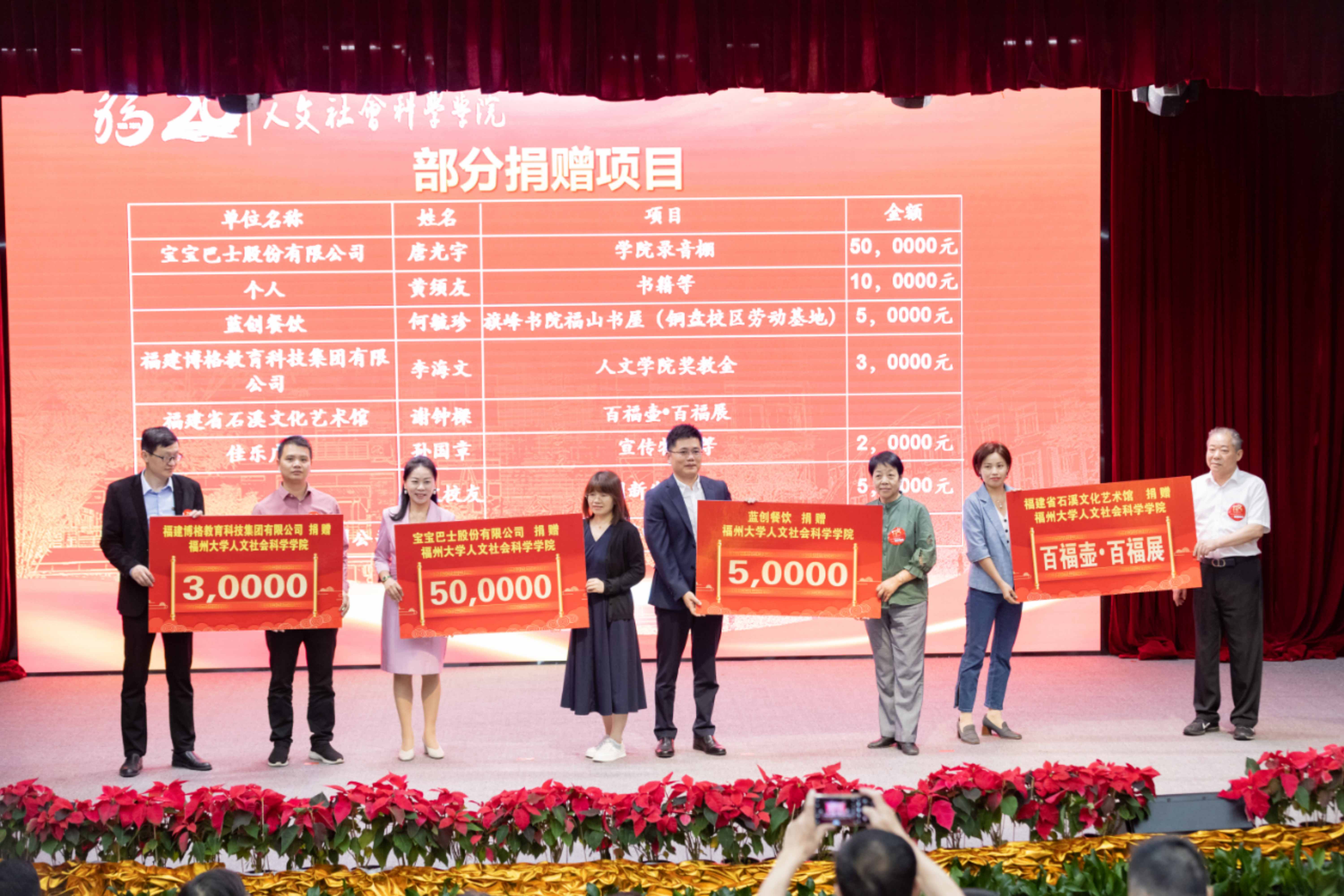 随后,举行校友捐赠仪式。在院庆期间,宝宝巴士股份有限公司、蓝创餐饮、福建博格教育科技集团有限公司、福建省石溪文化艺术馆、佳乐广告等单位慷慨解囊,捐款捐物,为学院发展添砖加瓦。此外,奈飞工厂